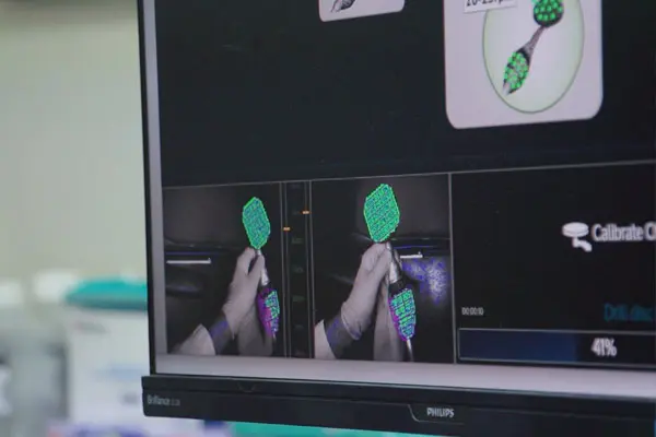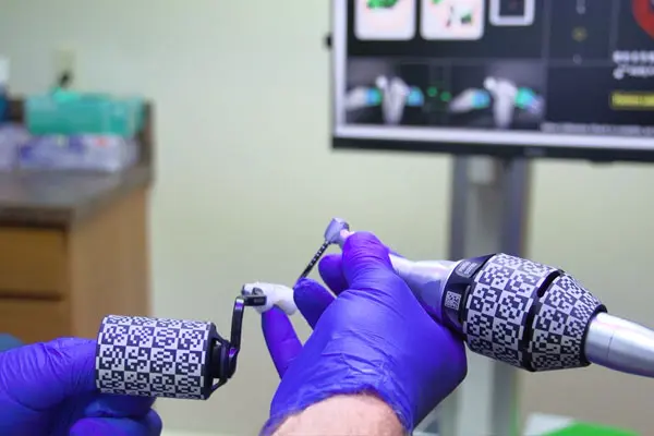This 3D navigation machine produces interactive, step-by-step, guidance for us to place dental implants in a way that is both precise and accurate, hitting the right depth and angle. This state-of-the-art equipment draws on the images created by our IOS and CBCT to direct the implant placement without costing unnecessary time to print a surgical guide.